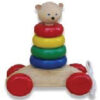 Bằng gỗ tự nhiên. Đầu hình con gấu. KT: 150x70x170(mm), có bánh xe, dây kéo. Thân gấu là những vòng tròn sơn màu, xếp thành hình tháp. Xe lật ngược lại ráp thành hình chiếc thuyền.
